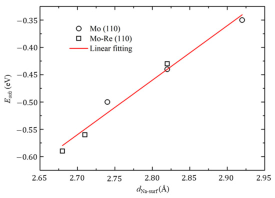 Adsorption energy of Na on Mo (110) and Mo-Re (110) surfaces. is the adsorption energy, and is the vertical distance between the adsorbate and the top layer of the slab model.