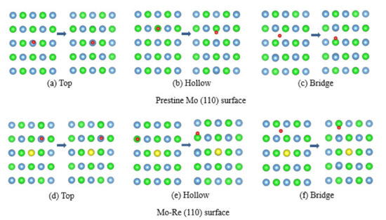 Initial and final configurations of O adsorption on Mo (110) and Mo-Re (110) surfaces. Scheme 110. surface. Snaps (a–c) show O atoms initially placed at Top site, Hollow site and Bridge site of Mo (110) surface, while snaps (d–f) show O atoms initially placed at Top site, Hollow site and Bridge site of Mo-Re (110) surface. Blue and green spheres represent Mo atoms in the first layer and the second layer. Yellow and red spheres represent Re atoms and O atoms, respectively.