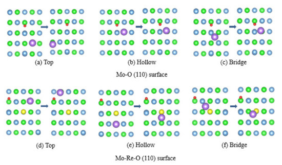As listed in Table 3, The Hollow site is energetically preferred for O adsorption on the Mo (110) surface with the adsorption energy of −4.09 eV. It is worth noting that the O atom initially placed at the Bridge site will spontaneously move to the Hollow site after the structure optimization as shown in Figure 5c. The O atom can also be stabilized at the Top site, but the adsorption energy is only −2.80 eV. As with Na on Mo (110) surface, the shorter vertical distance between O atom and the substrate () leads to a lower (more negative) adsorption energy. For the Mo-Re (110) surface, the Hollow site is also the most favored for O adsorption and the corresponding adsorption energy is −4.14 eV, which is even 0.05 lower than the adsorption energy of O at the Hollow site of Mo (110) surface. It is worth mentioning that all un-equivalent Hollow sites around the Re atoms are checked, and Figure 5 as well as Table 3 demonstrates configurations with the lowest energy. As with the pristine Mo (110) surface, the O atom initially placed at the Bridge site of the Mo-Re (110) surface will move to the Hollow site after the structure relaxation. In addition, the O atom can be stabilized at the Top site with a much higher adsorption energy of −2.82 eV. As with Na adsorption, the Re atom in the surface can also strengthen the attractive interaction between the adsorbed O atom and the Mo-based substrate.