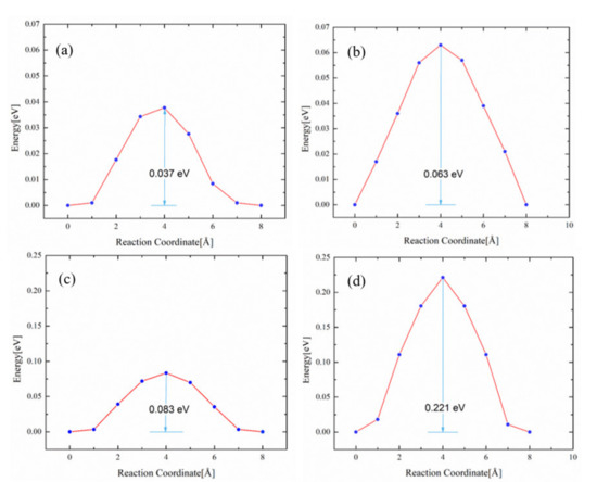 Figure 7 show the energy barrier of Na migration from one most stable site to its first-nearest most stable site is also calculated in this work using CI-NEB method. Our theoretical results show that the diffusion barrier of Na on Mo (110) surface is 0.037 eV, while it is 0.063 eV on the Mo-Re (110) surface. It can be inferred that the Re atom can slower down the Na diffusion kinetics on the Mo surface. The impact of pre-adsorbed O on the Na diffusion is also investigated. For the Mo (110) surface, the pre-adsorbed O atom can increase the diffusion barrier to 0.087; for the Mo-Re (110) surface, the pre-adsorbed O can significantly increase the Na diffusion barrier to 0.221 eV. Therefore, it can be inferred that both the existence of O impurity and Re alloy atoms can block the Na diffusion on the Mo surface.