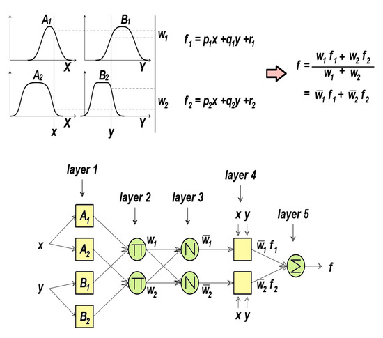 As displayed, ANFIS consists of two inputs (x and y), and one output (f) that are related by rules in the form of: