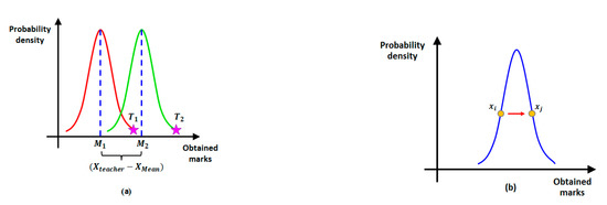 Teacher phase: In the first phase, the teacher who has more knowledge than others is selected from students. The teacher seeks to bring the class mean toward his/her average. In reality, however, this is not possible, i.e., not all students can reach the teacher level of knowledge, but they indeed change the average to a new value of . In this case, a new statistical community emerges whose average is and the teacher is . This process is repeated over the first phase until they develop a better or optimized population. In Figure 2a, is selected as the class teacher and tries to bring the average class level to his/her level.