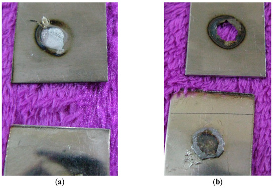 - Mansor, M.S.M.; Yusof, F.; Ariga, T.; Miyashita, Y. Microstructure and mechanical properties of micro-resistance spot welding between stainless steel 316L and Ti-6Al-4V. Int. J. Adv. Manuf. Technol. 2018, 96, 2567–2581. [Google Scholar] [CrossRef]