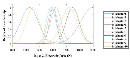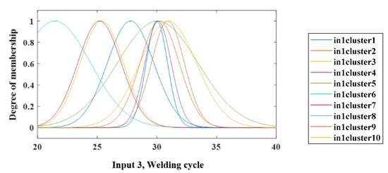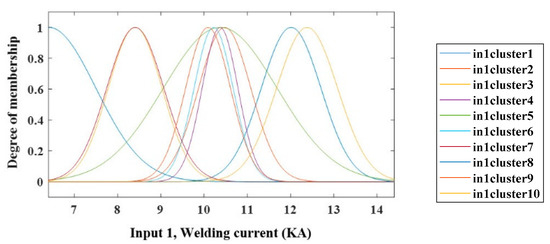 In this study, 31 experimental data are employed for testing the network which including four inputs (the welding current, electrode force, welding cycle and cooling cycle) and one output (TSS). This data set is randomly divided into two subsets of 70% for network training and 30% for network testing. The number and parameters of input and output membership functions as well as fuzzy if-then rules are optimized using TLBO algorithm. Figure 5, Figure 6, Figure 7 and Figure 8 show the optimized Gaussian membership functions for the input variables.