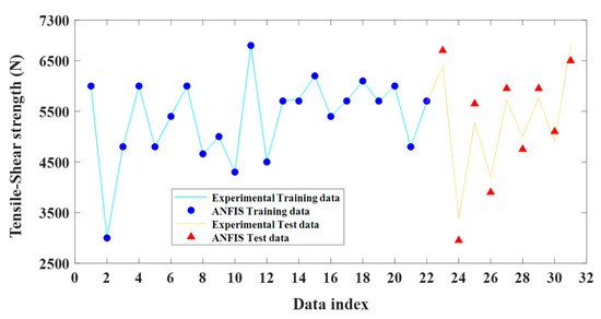 In these diagrams, the circular markers represent the data used in the training section and the triangular markers are for the network test data. The midline is also a reference for determining the correctness of the obtained model. As can be seen, the accuracy of the ANFIS network is exceptional in estimating the data of the training and test section (circular and triangular markers are located close to the midline). Figure 10 shows the TSS for the actual and predicted data in the training and test section. In these diagrams, the lines in blue and orange are related to the experimental data of the training and test section, respectively. Circular and triangular markers are also related to the data predicted by the ANFIS network associated with training and test section, respectively. As observed, the ANFIS network corresponds to the data in the training section (circular markers match blue lines). The second part of the plots (i.e., the orange part) also shows that the network has been able to properly predict the data pertinent to the test section.
