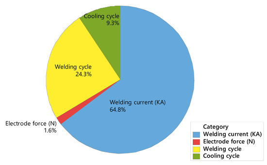 In Figure 16 the result of Sobol sensitivity analysis for the TSS of dissimilar joints is shown. The data in Figure 16 were achieved by Simlab software which simultaneously changes the input process parameters and evaluated their effects on output [27]. As can be seen from Figure 16, all the process parameters significantly influence the TSS of the welds. It also concluded that the parameters of welding current, welding cycle, cooling cycle, and electrode force have the greatest effect on the strength of the dissimilar joints, respectively.