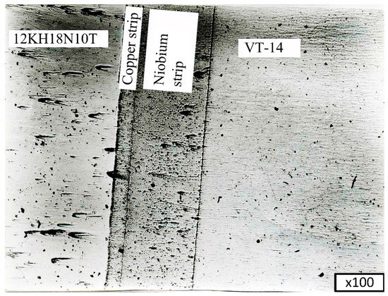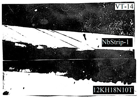 The thickness measurements of the intermediate layers of niobium and copper, performed on thin sections of the bimetallic VT-14+Nb+Cu+12KH18N10T compound, showed that the average thickness of niobium was 0.2 mm, and the average thickness of copper was 0.02 mm. The niobium and copper interlayers were solid, and no breaks were observed, as shown in Figure 12.