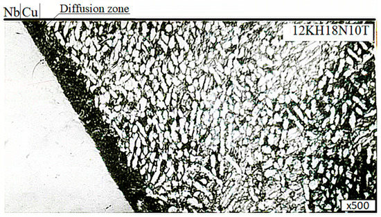 The diffusion zone at the 12KH18N10T + M1 and niobium + copper boundary was not revealed by metallographic studies; for this, it was necessary to select the appropriate thin section preparation. However, the presence of this a zone was confirmed in works [1]. Moreover, the predominant character of intercrystalline diffusion was noted. The most complete study of steel + copper bimetal can be found in [2,3].