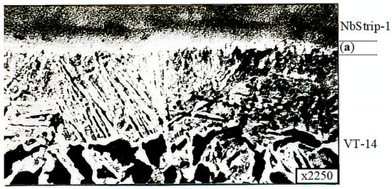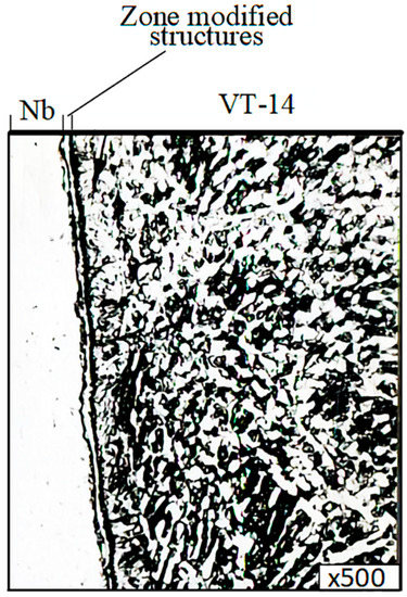 In addition, it was found that the microstructure of the microsection titanium component consisted of a mixture of (a + b)-phases and corresponded to type 4–6 of the 9 typical scales for (a + b)-titanium alloy microstructures, according to OST 97 9465-81. At the point of contact of the thin section component in the niobium interlayer, a zone characterized by a modified structure (a diffusion zone) with a width of up to 0.011 mm was found, as shown in Figure 19.