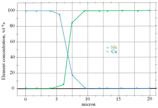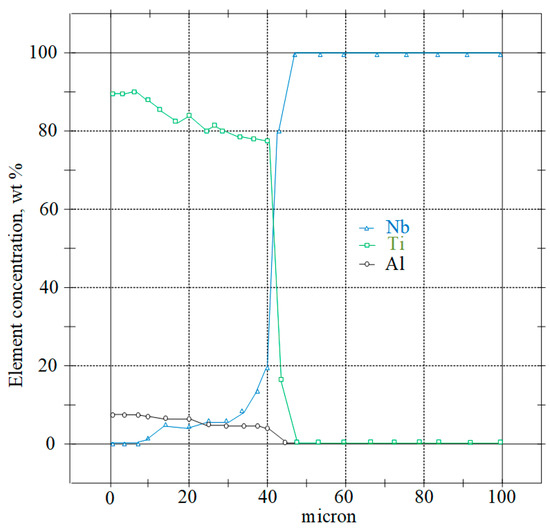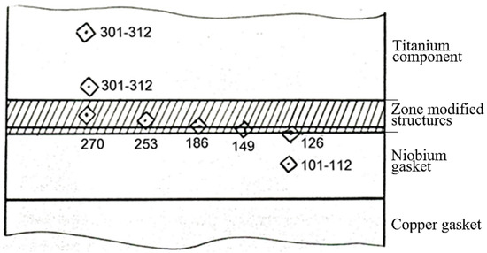 The results showed that the microhardness of the titanium core was equal to 301–312 HV. The microhardness of the niobium pad was 112–101 HV. The microhardness of the transition zone had an intermediate value of 270–186 HV (Figure 16), which was also confirmed the diffusion interaction of the contacting metals.