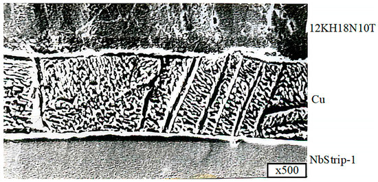 The maximum bond strength at 293 K in various experiments reached 320–350 MPa, which meets the technical requirements. Furthermore, it was found that in all cases, the destruction of the samples occurred over the entire area of the sample, along the copper interlayer (NbStrip-1), as shown in Figure 10.