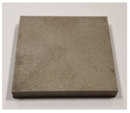 The SLM equipment was developed in-house as shown in Figure 1. A fiber laser with its wavelength at 1070 nm and a maximum power of 500 W was used. The laser spot size on the surface of the powder bed is about 100 μm. To prevent the metal powder from being oxidized during the manufacturing process, argon was used as the protective gas, and the oxygen content was constantly maintained at below 100 ppm (parts per million) during the manufacturing process. A laser power of 340 W, scan speed of 1250 mm/s, and layer thickness of 60 μm were used to produce the samples. The powder bed was heated to a temperature of 100 °C to reduce the thermal deformation of the samples. The process parameters are presented in Table 2, and the dimensions of the additively manufactured sample were 40 mm × 40 mm × 4 mm. After the additive manufacturing was complete, the sample was subjected to annealing heat treatment (the environmental temperature was raised to 800 °C for 60 min and held for 2 h, followed by air cooling). The final sample after machining is shown in Figure 2. The Leica MC170HD inverted-phase metallographic microscope (Leica, Berlin, Germany) was used to observe the microstructure of the sample under magnifications of 50× and 500×. As shown in the Figure 3, no holes and defects were observed within the microstructure.