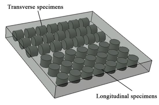 To study the compressive deformation behavior of the final prepared AM-TC-4 alloy and the difference in mechanical properties between this material and the TC-4 alloy prepared via the traditional manufacturing process, the AM-TC-4 alloy and TC-4 alloy specimens (diameter D = 4 mm and thickness L = 2 mm) were prepared via the WEDM process. Among them, AM-TC-4 was sampled along the longitudinal printing direction (AM-P-TC-4) and transverse printing direction (AM-T-TC-4) to study the difference in the mechanical properties of AM-TC-4 in different printing directions; the sampling method is illustrated in Figure 4. Furthermore, the mechanical properties of the two materials under quasi-static and dynamic compressive deformation conditions were studied through the Material Universal Testing Machine (MUTM) and SHPB testing equipment (Figure 5). Specifically, the MUTM was used to compress the two materials at a constant strain rate and 286 K. In the test, the crosshead speeds were 1.2 mm/min and 12 mm/min. An extensometer was used to record the load-deformation relationship during the specimen deformation. The engineering stress–engineering strain and strain rate of the specimen were calculated using Equations (1)–(3):