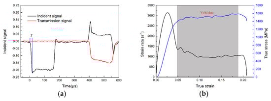 In the SHPB test, it is very important to ensure the stress balance and constant strain rate deformation of materials. Figure 6a,b were, respectively, the waveform diagram and the variation law of stress and strain rate with the strain of the 3D-printed TC-4 material under the deformation conditions of temperature 289 K and strain rate 1200 s−1. According to Figure 6a, the rise time of the incident wave loading section in the experiment is T = 16.6 μs. The longitudinal wave depth of the TC-4 material was about 5130 m/s. when the loading force of the incident wave on the specimen reached the maximum, the stress wave repeatedly propagated in the specimen about 42 times. Therefore, it could be considered that the stress balance was reached everywhere in the specimen before plastic deformation.