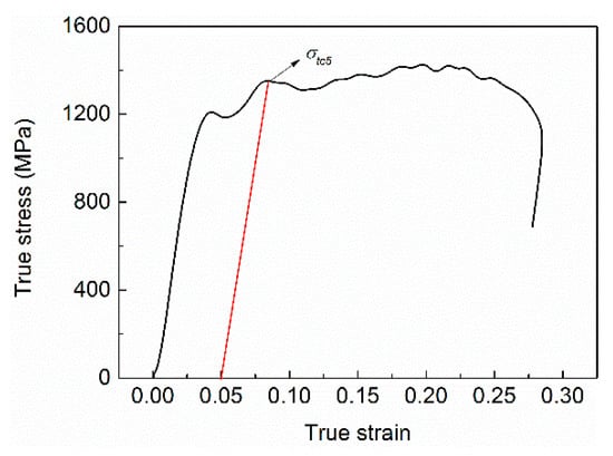 Using MTS and SHPB test devices, the relationships between the equivalent plastic strain () and the equivalent stress () for TC-4 and AM-P-TC-4 specimens in the temperature range of 286–1073 K and strain rate of 0.1–4100 s−1 were obtained. With the stress value corresponding to the total strain of 0.05 as the apparent yield strength () of the material [,], Figure 7 is the schematic diagram of yield point selection. Moreover, the stress–strain relationship of the AM-T-TC-4 specimen at room temperature and a strain rate of 0.1–4100 s−1 were obtained. The results are shown in Figure 8.