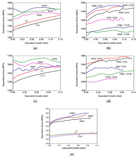 In addition, 50 TC-4 mechanical samples, 40 AM-P-TC4 samples, and 20 AM-T-TC4 samples were prepared, respectively, and three effective repeated tests were carried out for each deformation condition, and the test data within the constant strain rate range were averaged to ensure the reliability of the data. Figure 8a,b show the relationship of the TC-4 material prepared via the traditional process under normal-temperature (286 K) and high-temperature (473–1073 K) compressive deformation conditions. Figure 8 c,b show the relationships of AM-P-TC-4 specimens under compressive deformation conditions at room temperature (286 K) and high temperature (473–1073 K), respectively. Figure 8e shows the relationship of the AM-T-TC-4 specimen under compressive deformation conditions at room temperature (286 K). According to the data in the figure, both materials exhibited certain work hardening and strain rate strengthening effects. The yield strength of the material increased with increasing strain rate, and the flow stress () of the material increased with increasing plastic strain. Moreover, as the environmental temperature increased, the yield strength and flow stress of the material gradually decreased. In addition, under dynamic deformation, the heat generated by the material deformation could not be immediately transferred outward, so that the material temperature gradually increased with increasing deformation. Therefore, under high-strain rate deformation, the thermal softening effect reduced the slope of the material stress–strain curve. An additional analysis was performed on the influences of temperature and strain rate on the yield strength and fracture behavior of materials based on the experimental data in Figure 8.