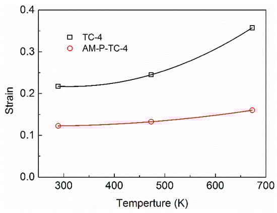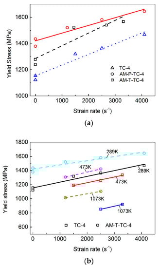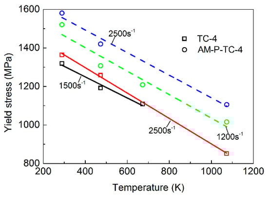Figure 10 shows the relationship between the yield stress of TC-4 and AM-TC-4 materials and the initial environmental temperature under different strain rates. In the temperature range of 289–1073 K, the yield strength of the two materials decreased linearly with increasing environmental temperature. Second, the high-temperature strength of AM-P-TC-4 was also greatly higher than that of TC-4. At a strain rate of 2500 s−1, the initial environmental temperature increased from 289 K to 1073 K, and the yield strength of TC-4 material decreased from 1370.9 MPa to 853.5 MPa, a decrease of about 37.7%. Under the same conditions, the yield strength of the AM-P-TC-4 material decreased from 1557.9 MPa to 1099.7 MPa, a decrease of about 29.4%. It can be seen that the thermal sensitivity of AM-P-TC-4 was lower than that of the TC-4 material; that is, AM-P-TC-4 had higher strength and relatively better thermal stability at high temperatures.