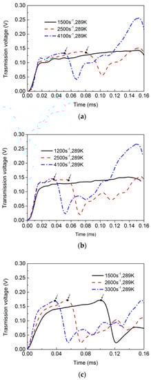 Figure 11a–c show the transmission voltage signals of TC-4, AM-P-TC-4, and AM-T-TC-4 under impacts of different strain rates, obtained by SHPB test. According to Equation (6), the transmission voltage signal is positively correlated with the deformation stress of the material. When the material breaks during the stress wave loading process, stress unloading occurs inside the material, which causes the transmission voltage signal to drop sharply in the first loading cycle. As the broken material is further compacted, the subsequent voltage signal rises again. The first inflection point at which the voltage signal appears to fall is taken as the time when the material breaks during the deformation process. The strain when the material breaks can be roughly estimated by Equation (9).