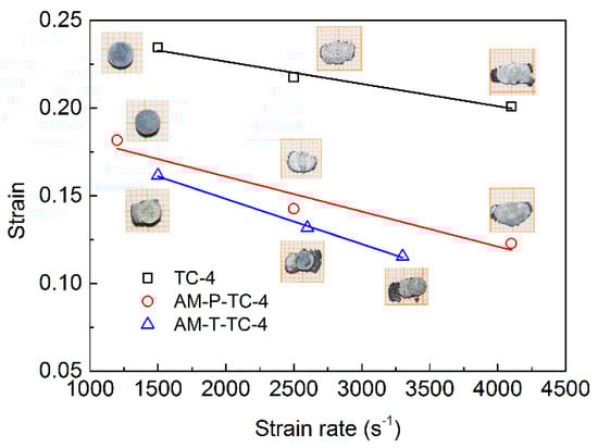 Figure 12 shows the corresponding relationship between the maximum strain of the three materials TC-4, AM-P-TC-4, and AM-T-TC-4 (calculated according to Equation (9)) in the first loading cycle under normal temperature conditions and the deformation strain rate, and the deformation state of the corresponding specimen. Compared with the traditional TC-4 material, the TC-4 titanium alloy material prepared via the 3D-printing process was more prone to fracture due to adiabatic shear under the same deformation conditions. In addition, the maximum fracture strain of the material in different printing directions was also different. Under a strain rate of 2500 s−1, the fracture strain of the traditional TC-4 material reached 0.2175, while the fracture strains of AM-P-TC-4 and AM-T-TC-4 were 0.1425 and 0.1316, respectively, which were 52.6% and 65.3% lower than that of the traditional TC-4 material, respectively.