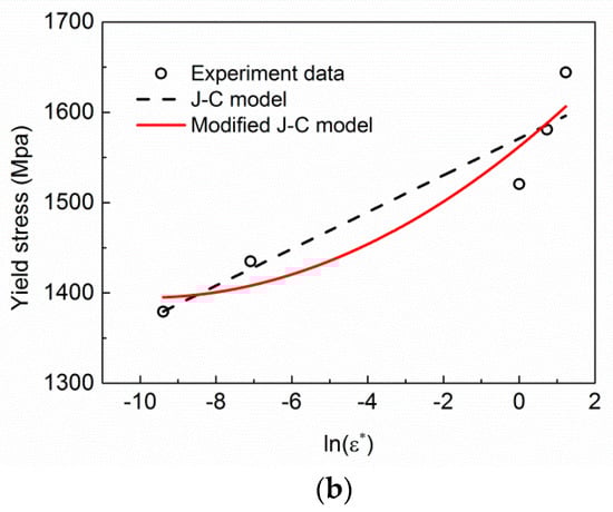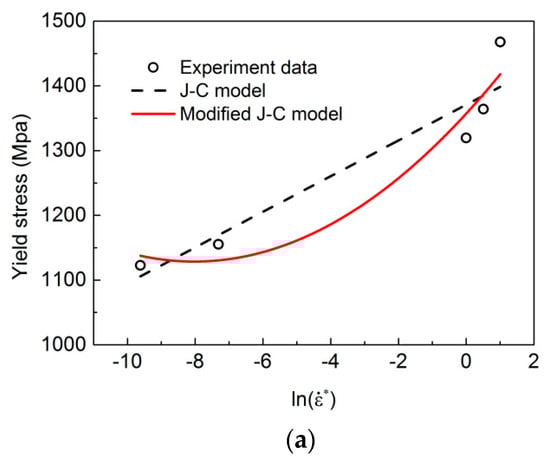 Under the reference temperature and the reference strain rate, Equation (11) is used by the J-C constitutive to describe the relationship between the yield strength of the material and the strain rate; that is, when the plastic strain , Equation (10) can be simplified as