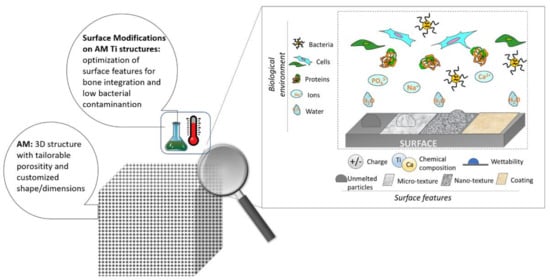 In fact, surface properties have a key role in tissue integration, but, despite the wide literature on AM, limited research has been performed up to now on surface modifications of AM Ti-based materials for biomedical applications. The surface modification of AM constructs is a promising strategy for the modulation of the biological response of AM implants, and in particular for the enhancement of their bone bonding ability as well as to counteract bacterial infections.
