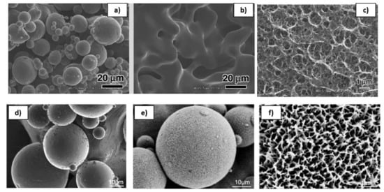 Moreover, chemical treatments such as alkali treatments (NaOH) [,], mixed acids (H2SO4-HCl) treatments [,], combination of acid (HCl) and hydrogen peroxide (H2O2), with eventual pre-etching of the surface [,], hydrothermal treatments in NaOH [], and electrochemical oxidation [,] can produce peculiar micro/nanotextured layers on the surface of AM Ti-based structures. The appearance of nanotexture, after chemical or hydrothermal treatments, is shown, as examples, in Figure 2c,f. It can be observed that the nanotexture can be obtained both on the surface after the removal of unmelted particles, or superimposed to the surface particles. Most of these surfaces are characterized by inorganic bioactivity (ability to induce hydroxyapatite precipitation in simulated body fluid) [,,], by the ability to stimulate osteoblast activity [,,,], and direct bone bonding [,,,].