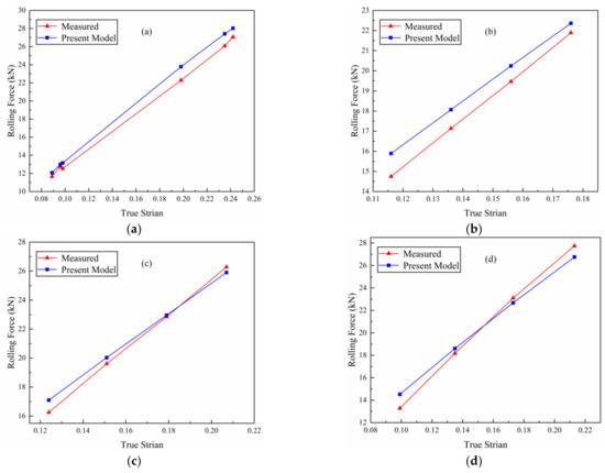Figure 8 shows the comparison between the calculation results of the dynamic model in this paper and the experimental results. Figure 8a shows shows the comparison result when the roll gap reduction velocity is 0 mm/s, which is a static rolling. The maximum error between the model calculation result and experimental result is 6.72%. Figure 8b–d are the comparison results when the roll gap reduction velocity is 0.035 mm/s, 0.047 mm/s, and 0.065 mm/s, respectively; they are the dynamic rolling process. The maximum error is 9.37%, and the average error is only 3.8%. The dynamic model can predict static rolling force and dynamic rolling force simultaneously, which is consistent with the experimental results, indicating that the model has high accuracy.