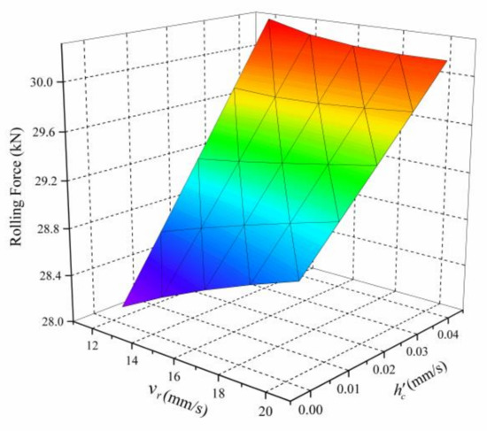 As shown in Figure 9, the influence of the rolling velocity and roll gap reduction velocity on the dynamic rolling force is analyzed when the exit thickness is 1.816 mm (No change in thickness during analysis and calculation). When the roll gap reduction velocity is 0 mm/s, the rolling force increases with the increase of the rolling velocity. This phenomenon is mainly because the average deformation rate increases with the increase of the rolling velocity. At the same time, the deformation resistance increases with the increase of the average deformation rate. The rolling force increases with the increase of the deformation resistance. This shows that the rolling force increases with the increase of the average deformation rate. When the rolling velocity is constant, the rolling force increases with the increase of the roll gap reduction velocity, which is also due to the increase in the average deformation rate of the metal in the deformation zone due to the roll gap reduction velocity. However, when the roll gap reduction velocity is 0.04 mm/s, the rolling force increases initially and then starts to drop with the increase of the rolling velocity. When the roll gap reduction velocity increases to 0.06 mm/s, the rolling force gradually decreases with the increase of the rolling velocity. This phenomenon is contrary to the law of static rolling. When the roll gap reduction velocity exists, additional deformation zone II will appear. The length x1 of the deformation zone II is affected by the roll gap reduction velocity rate to the rolling velocity. When the roll gap reduction velocity is constant, the increase of the rolling velocity will cause the decrease of x1, affecting the deformation zone length. Therefore, the reduction of rolling force is mainly due to the reduction of the deformation zone length.