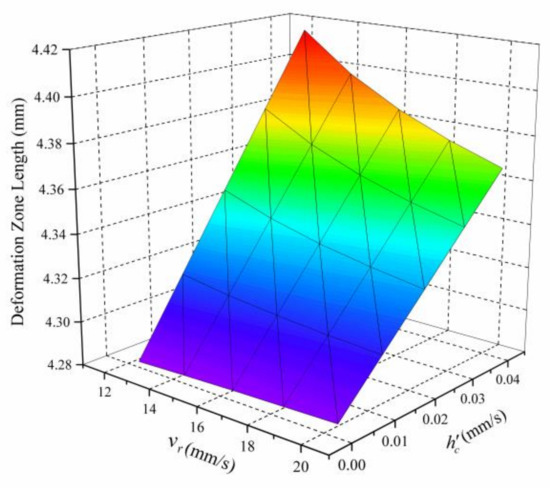 In order to determine the reason for the reduction of rolling force during dynamic rolling, Figure 11 and Figure 12 calculate the influence of rolling velocity and roll gap reduction velocity on the deformation zone length when the exit thickness is 1.816 mm and 1.57 mm (No change in thickness during analysis and calculation), respectively. As shown in Figure 10 and Figure 11, when the rolling velocity is constant, the deformation zone length increases with the increase of the roll gap reduction velocity. When the roll gap reduction velocity is 0 mm/s, the deformation zone length increases slightly. Only deformation zone I exists, which is caused by the increase in the rolling force. When there is a roll gap reduction velocity, as the rolling velocity increases, the deformation zone length has been significantly reduced, which is mainly due to the reduction of the deformation zone II. With the increase of the roll gap reduction velocity, the increase in the average deformation rate cannot offset the effect of the reduction in the deformation zone length on the reduction of the rolling force. This indicates that the change in the deformation zone length plays a leading role in the change of the rolling force at this time. When the roll gap reduction velocity is 0.08 mm/s, the deformation zone length decreases sharply with the increase of the roll velocity, which further shows that the reduction of the rolling force is caused by the reduction of the deformation zone length.