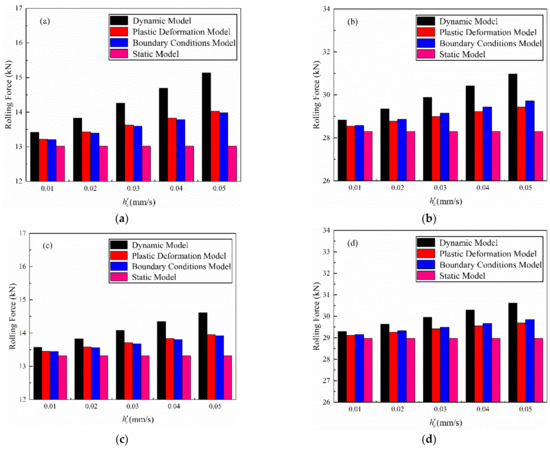The contribution of the average metal deformation rate and dynamic boundary conditions to the dynamic rolling force value. The strip exit thickness and rolling velocity are respectively: (a) 1.816 mm, 12.5 mm/s; (b) 1.57 mm, 12.5 mm/s; (c) 1.816 mm, 20.5 mm/s; (d) 1.57 mm, 20.5 mm/s.