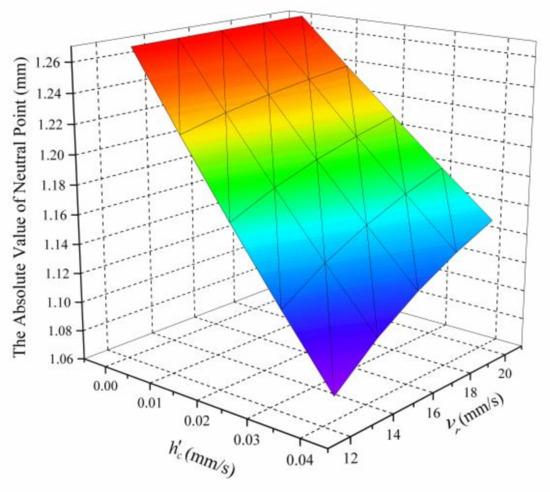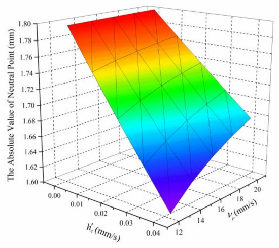 As shown in Figure 14 and Figure 15, the influence of roll gap reduced velocity and rolling velocity on the neutral point position is analyzed when the exit thickness are 1.816 mm and 1.57 mm in dynamic rolling. When roll gap reduction velocity is 0 mm/s, the neutral point position is almost unchanged. When the rolling velocity is constant, the range of the neutral point moving to the exit position increases with the increase of the rolling velocity. When roll gap reduction velocity is constant, as the rolling velocity increases, the position of the neutral point moves to the exit position. The range of movement increases with the increase of the roll gap reduction velocity. Moreover, it can also be seen that under reasonable rolling parameters, the neutral point will not appear in deformation zone II, indicating that the assumptions of this model are correct.