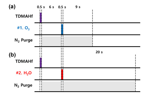 Two HfO2 RRAM devices with different oxygen reactants were fabricated as follows. Organic material of a 6-inch silicon wafer was removed by SPM and HPM standard cleaning processes. Ion implantation was carried out by a medium current ion implanter (Varian, E220) to increase the conductivity of silicon substrates and use them as bottom electrodes. The dose of BF2+ was 5 × 1015 cm−2, and the acceleration energy was 40 KeV for the p++-Si surface. Here, we removed native oxide by HF dipping and metallic contaminants by HPM cleaning. After the bottom electrode was fabricated, a 20 × 20 mm specimen sample was produced using a dicing saw. Additionally, HfO2 7 nm as the switching layer was deposited using ALD by tetrakis (dimethylamino)hafnium (TDMAHf) and other oxygen reactants (O3 and H2O). First, the ALD (CN1, Atomic premium) process sequence of O3-based HfO2 for one cycle is as follows. TDMAHf 0.5 s/N2 purge 6 s/O3 0.5 s/N2 purge 9 s, shown in Figure 1a. Second, the ALD process sequence of H2O-based HfO2 for one cycle is only different from the last oxygen reactants’ purge time at 20 s, shown in Figure 1b. In this work, we optimized the growth per cycle in HfO2 with the H2O precursor by controlling the reactant dosing time, reactant purge time, and stage temperature, shown in Figure S1. Because H2O is not easily removed from the chamber, it requires a relatively long purge time compared to O3. In order to deposit the same target thickness of 7 nm, O3 and H2O were used to perform 68 cycles at 350 °C and 84 cycles at 260 °C, respectively. Finally, a 100 nm thick Ni as the top electrode was deposited as TE by an E-gun evaporator (MAESTEK, ZZS550, Pyeongtaek, Korea), and the cells were separated using a shadow mask. A Keithley 4200-SCS semiconductor parameter analyzer and a 4225-PMU Solon. OH, USA in the probe station were used to measure the electrical characteristics. Additionally, a bias was applied to the top electrode and the bottom electrode was grounded.