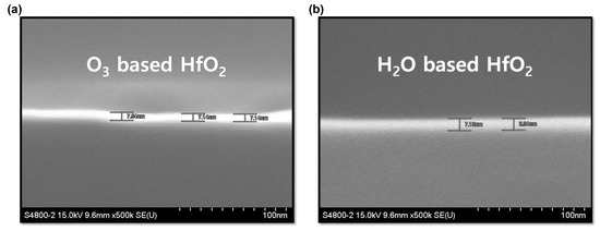 - Cheng, Y.L.; Chang, Y.L.; Hsieh, C.Y.; Lin, J.R. Comprehensive comparison of structural, electrical, and reliability characteristics of HfO2 gate dielectric with H2O or O3 oxidant. J. Vac. Sci. Technol. A 2013, 31, 01A141. [Google Scholar] [CrossRef]