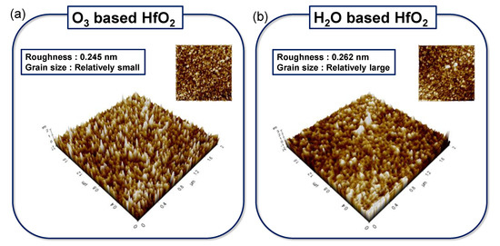 We confirmed the thickness of the dielectrics by cross-sectional SEM imaging before we compared the resistive switching properties of both samples, shown in Figure 2a,b. The HfO2 layer of the H2O sample and O3 sample were both about 7 nm, which corresponded to the target deposition thickness. The resistive switching could be affected by the roughness effects [57]. Figure 3a,b shows the surface of two samples of HfO2 measured in the non-contact mode of AFM. Each mean value of roughness was 0.245 nm and 0.262 nm for the O3 sample and H2O sample, respectively. It was found that the surface roughness of the O3 sample and H2O sample did not differ greatly.