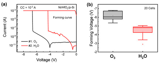 Figure 5a shows the I–V characteristics in both samples. The O3 sample requires approximately 2 V higher forming voltage than the H2O sample. Forming voltage is an initial characterization of the device and cannot be controlled, unlike the set voltage and reset voltage. Forming voltage distribution in 20 cells is displayed in Figure 5b. In terms of initial current, the H2O sample has a higher initial current than the O2 sample. For the H2O sample, the quality of the thin film is not good, and there are a lot of (C, H) impurities in the dielectric [57,58]. However, since there are relatively many oxygen defects, which could be beneficial to RRAM behaviors, it is easier to operate the resistive switching with a smaller voltage compared to O3 RRAM. In general, if there are many defects of the dielectric and interface in MOSFET, the performance of the transistor deteriorates, but in the case of RRAM, an oxygen defect should exist for the current to flow well. In addition, C, H impurity can become a conductive path, which additionally provides a path for electrons to move, and the operating voltage is lowered [61].