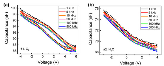 Next, we investigated the initial state to find the effect of oxygen precursor on the electrical characteristics of the HfO2-based metal–oxide–semiconductor capacitor. Figure 4a,b show the C–V characteristics with different frequency ranges (1 kHz to 500 kHz). The O3 sample has higher capacitance values than the H2O sample. Although the O3 precursor has a stronger oxidizing ability than H2O precursor, unwanted interfacial growth of SiOx on a silicon substrate is higher [58,59], but since there are fewer interface traps at the interface in the O3 sample, it was judged that the capacitance value will be larger in O3 sample. A correlation study of the growth rate, thickness uniformity, stoichiometry, and hydrogen impurity level was discussed in previous work [60].