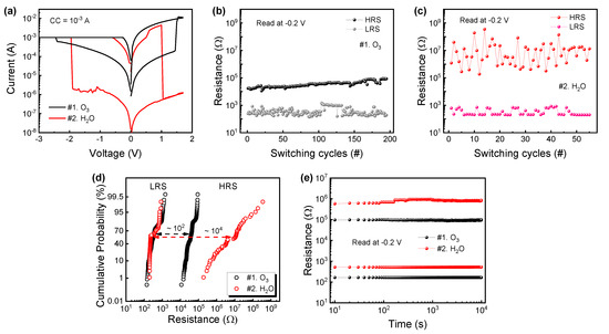 (a) I–V curves of two Ni/HfO2/Si RRAM samples. Endurance cycles of (b) O3 sample and (c) H2O sample. (d) Cumulative probability two samples in LRS (low-resistance state) and HRS (high-resistance state). (e) Retention test for two samples.