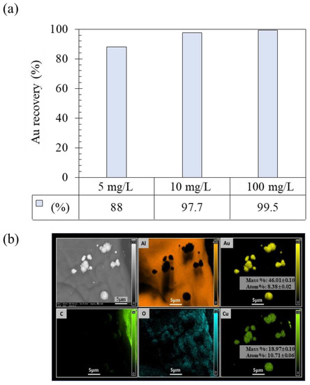 (a) Recovery of Au ions from ammonium thiosulfate solutions with varying initial concentrations from 5 to 100 mg/L, and (b) SEM photomicrographs with corresponding elemental maps of the recovery residue at 10 mL/L of Au initial concentration.