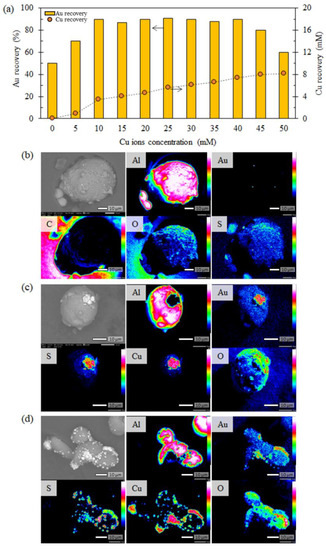 (a) Recovery of gold ions from ammonium thiosulfate solution with varying additions of Cu ions with concentrations from 0 to 50 mM, and SEM photomicrographs with corresponding elemental maps of the residues at (b) 0 mM, (c) 10 mM, and (d) 50 mM of Cu ion additions.