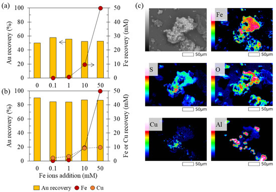 The effects of Fe ions on Au recovery are shown in Figure 4. Figure 4a,b shows the recovery of Au ions with varying addition concentrations of Fe ions in the absence and presence of Cu ions in the solution, respectively. In both cases, the results showed that the effects of Fe ions on Au recovery were negligible. This could be explained by the very low solubility of Fe ions under basic conditions [31]; hence, Fe precipitates are readily formed in the solution, which neither favors nor hinders Au recovery. The precipitate in the solution was analyzed by SEM-EDX and showed that Fe precipitates were formed in the solution as shown in Figure 4c. When 10 mM of Cu ions were added to the solution, Au recovery was enhanced and consistently showed about 85–90% Au recovery (Figure 4b), which indicates that Au can be successfully recovered regardless of the presence of Fe ions.