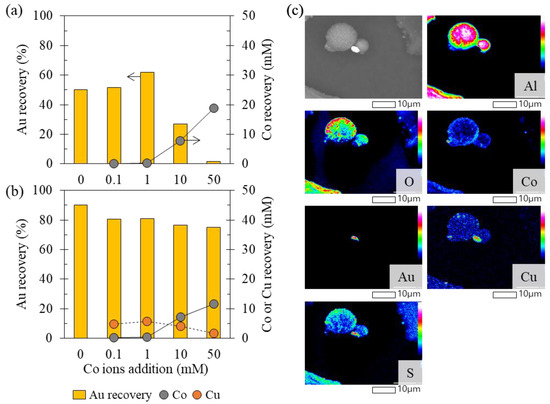 Recovery of gold ions from ammonium thiosulfate solutions with varying additions of Co ion concentrations from 0 to 50 mM (a) without and (b) with 10 mM of Cu ions in the solution, and (c) SEM photomicrographs with corresponding elemental maps of residue.