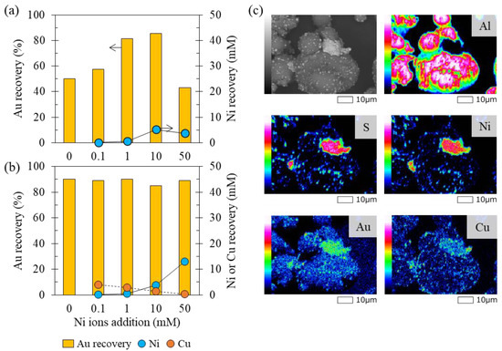 Figure 6a,b shows the effects of Ni ions on Au recovery with varying concentrations without and with Cu ions, respectively. The results showed that in the absence of Cu ions, Au recovery increased to 83% with the addition of 10 mM of Ni ions, then recovery decreased as the addition of Ni ions increased by the competitive reduction. In the presence of Cu ions, however, Au recovery was constantly high at all ranges of Ni ion additions [32]. Figure 6c presents the SEM-EDX analysis of the residue, showing that Ni, Cu, and Au were co-cemented on ZVAl particles.