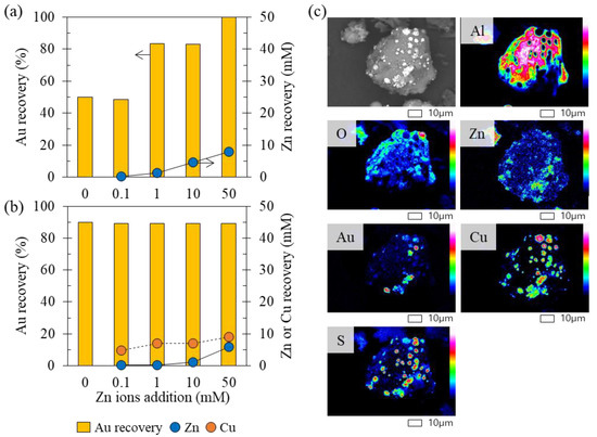 Recovery of gold ions from an ammonium thiosulfate solution with varying additions of Zn ion concentrations from 0 to 50 mM (a) without and (b) with 10 mM of Cu ions in the solution, and (c) SEM photomicrographs with corresponding elemental maps of residue.