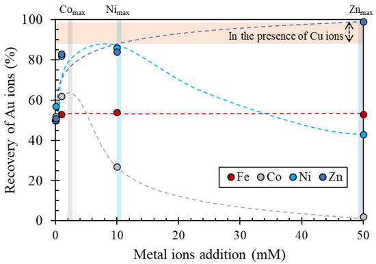 - Effect 4: In the presence of Cu ions, the effects of other coexisting metal ions were hindered, i.e., Au recovery was almost constant (the orange section illustrated in Figure 8), regardless of the presence of other coexisting metal ions.