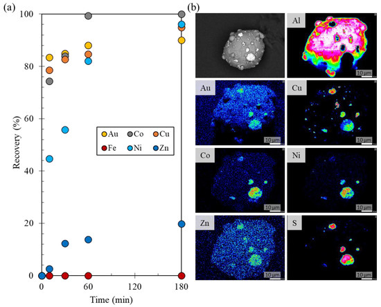 (a) Metal ion recovery from the ammonium thiosulfate solution containing all metal ions (i.e., Au, Co, Cu, Fe, Ni, and Zn ions) over time, and (b) SEM photomicrographs and corresponding elemental maps of the residue.
