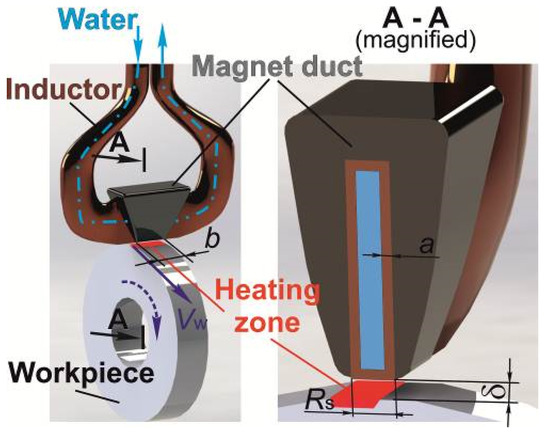 The main aim of modern mechanical engineering development is to ensure the production of competitive and high-quality products [1,2,3,4,5,6,7,8,9,10,11]. In this regard, the manufacturing industry is particularly interested in the development of a new type of technological equipment that allows the implementation of methods for modifying the surface layers of parts by processing them with concentrated power sources [12,13,14,15,16]. Local and ultra-high-speed thermal effects allow for the obtaining of higher values of hardness, strength, and viscosity, due to the formation of a highly dispersed metastable structure on the surface of the parts with a much higher dislocation density compared to volumetric machining and traditional approaches to surface hardening [5,7,8,9,10,11,12]. The development of high-frequency heating technology related to the use of radio frequencies, as well as to the miniaturization of inductors and equipping them with ferrite cores, has led to the emergence of a new method, i.e., high-energy heating with high-frequency currents (HEH HFC). This method allows for a technological quenching process with a specific heating capacity of about 400 MW/m2, which can successfully compete with other concentrated sources (laser, electron beam) meant for hardening the material without melting it (Figure 1) [7,12].