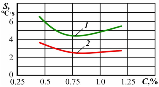 Dependence of the temperature–time characteristic on the carbon concentration in steel: (1) obtaining homogeneous austenite; (2) carbon content in austenite, with which 50% of martensite can be fixed at the cooling stage.