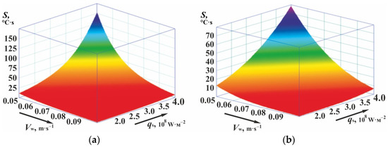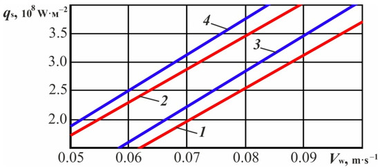 According to the depth of the hardened layer (h), specified in the drawing and based on the dependencies (2) and (4), we obtain the values of the integral temperature–time characteristic S. This characteristic must be achieved at a depth of 0.2 mm, equal, respectively, for steel U8 with h1—5.74 °C·s and h2—13.46 °C·s; for steel 45 with h1—7.485 °C·s and h2—17.83 °C·s. Further, based on these values of the characteristic S, according to the functional dependencies (Figure 5a,b), we obtain the functional dependence of technological modes Vw and qs. Figure 6 shows the surface sections for steel 45 (see Figure 5b) and steel U8 (see Figure 5a) with the appropriate values of the characteristic S. Any combination of modes (Vw and qs) that corresponds to these dependencies allows for the achievement of the target value of the integral characteristic at the depth of 0.2 mm, and therefore provides the specified depth of hardening under appropriate cooling conditions.