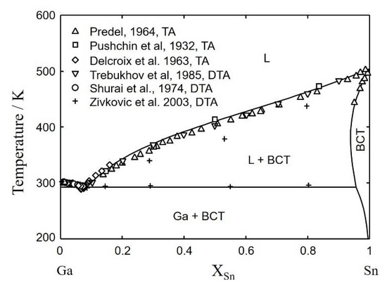 - Predel, B. Zustandsdiagramm und eigenschaften von Gallium-Zinn-Legierungen. J. Less-Common Met. 1964, 7, 347–355. [Google Scholar] [CrossRef]