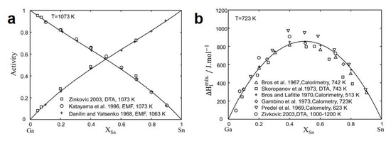 (a) Calculated activity of Ga (l) and Sn (l) in liquid at 1073 K along with experimental data from [42,45,46] and (b) mixing enthalpy of liquid at 723 K along with experimental data from [42,47,48,49,50,51].